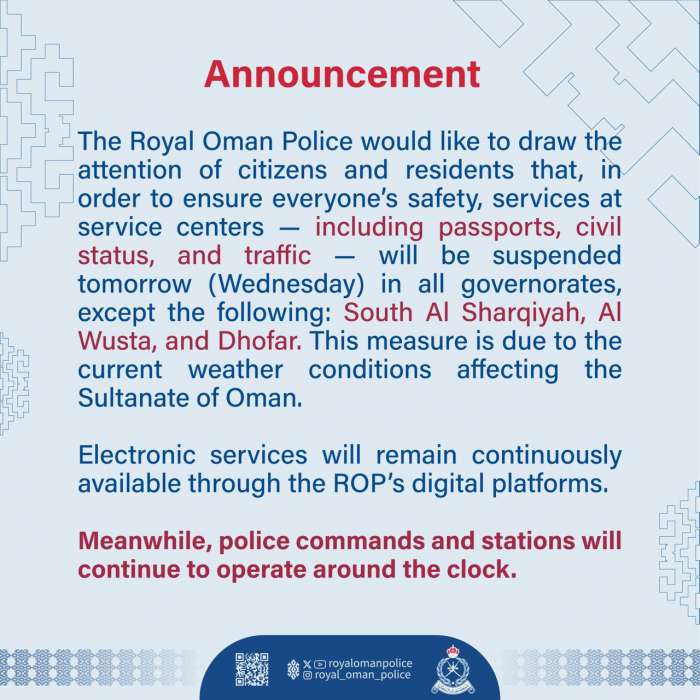 Muscat: The Royal Oman Police would like to draw the attention of citizens and residents that, in order to ensure everyone’s safety, services at service centers — including passports, civil status, and traffic — will be suspended on (Wednesday) in all governorates, except the following: South Al Sharqiyah, Al Wusta, and Dhofar.